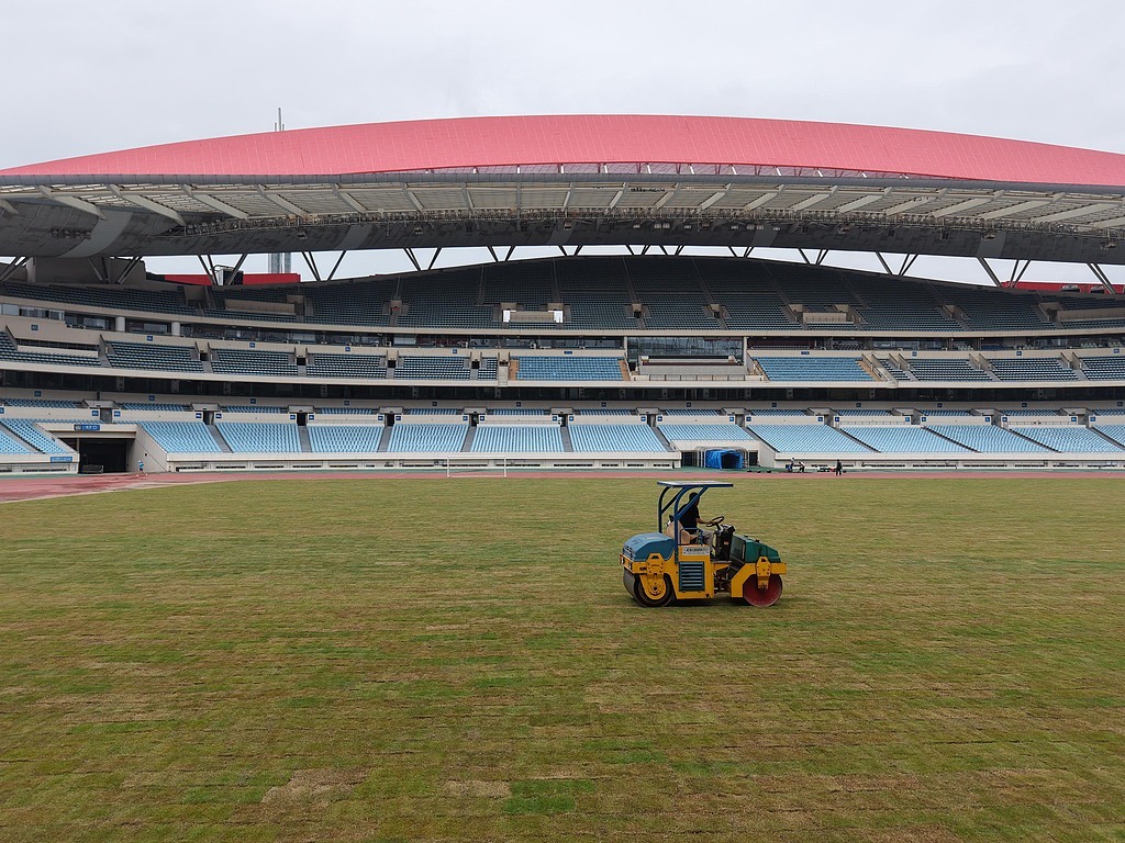 南京奥体中心为迎接新一轮苏超重新铺设了草坪。