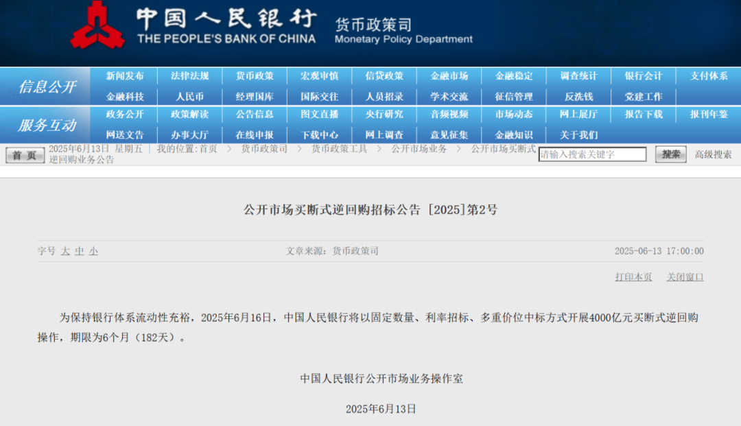 此外,6月13日,央行公告称,6月16日将以固定数量、利率招标、多重价位中标方式开展4000亿元买断式逆回购操作,期限为6个月(182天)。