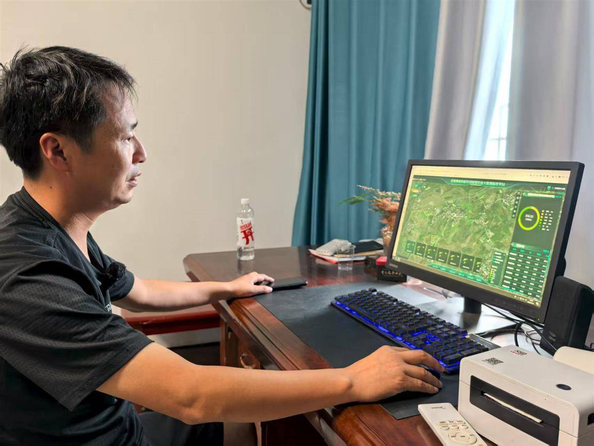 有了中国物流集团援建的“智慧大脑”,孝昌红菱果业负责人杨杜斯打开电脑即可查看桃子长势。(湖北日报全媒记者 方桐 通讯员 蔡青阳 摄)
